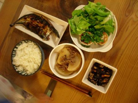 今日は、秋刀魚の開き・牛すじ大根・ひじきの煮物・山芋焼き