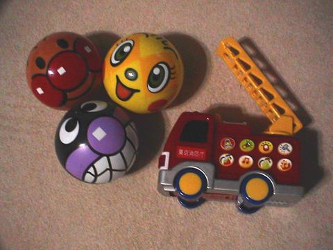 [:上:]アンパンマン、バイキンマン、メロンパンナちゃんのボール・消防車のおもちゃ・・・Tさんより。