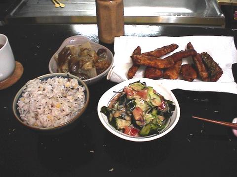 [:上:]晩御飯[:ごはん:]→“雑穀米・さんまの蒲焼・茄子と大根とごぼう天の煮物・トマトとワカメのサラダ”