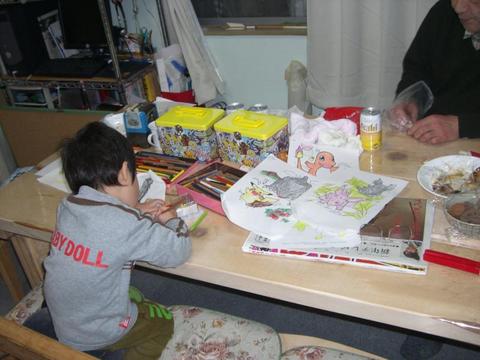 長男JJ(4歳)はお昼寝なしで、お義父さん・お義母さんとぬりえをしていたみたい[:ピース:]