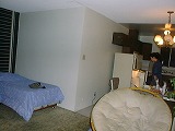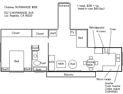 さて、今日からの宿探し、ダウンタウンに、カズエさんという人がマネージャーをしているというアパートがあることを知り、そこへ向かう。なかなかおもしろいおばさんである。簡単に契約も済み、1週間入居することにする。なかなか広い。間取りは以下の絵を参照。