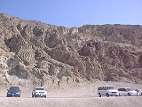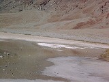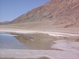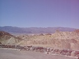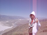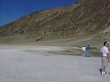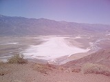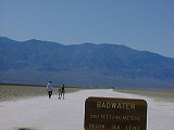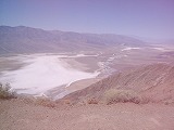 さて、AM8:30デスバレーまで北西へ車を走らせる。どこへいくにも本当に遠い。砂漠で何もない。景色はほとんどかわらない。昼前にやっと到着。まずは、デスバレー全体を見渡せるところまで13マイル細い道を登ってゆく。良い景色。13マイル引き返し、もと来た道を進んでいく。観光センター横のガソリンスタンドで給油。さすがに高い。ラスベガスの倍程である。次に、高さ数十メートルの岩の間をウォーキング3マイル、約1時間である。途中立ち止まってみると、何の音もせず、素晴らしい空間に包まれた。トカゲを数匹見ることが出来た。デスバレーといえども生物が生息しているようだ。次に訪れたのが悪魔のゴルフコース。でこぼこと隆起した土の上に干上がった塩があるというもの。そして、バッド・ウォーター、完全に干上がったもので数百フィート塩の道が続く。少し水が残っている部分には多量のヒルが生息していた。