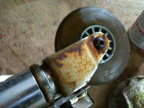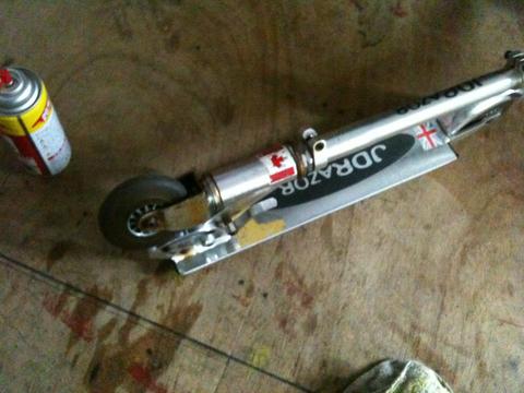 - https://www.johnnys-garage.com/Weblog/?eid=402キックボードのメンテ昨日(日曜日)、「キックボードのハンドルの高さ変えたいねん」と、二男坊のリクエスト。キックボードが錆びついてて、ハンドルの伸縮が出来ない状態。で、朝から事務所のゴミ片づけに行くついでに、ハンマーで叩き出そうとしたんですがビクともせず、CRE556流し込んで放置してました。で、一夜明けて今日、軽くハンマーで叩いたら伸縮できるようになりました。錆をペーパーで取り除いて平坦にして、グリスアップして完成。ついでに前輪まわりが錆びていたのも気に入らなくて、軽く錆び取りして完成です。ひどいところは、簡単には無理そうだったのでまた暇な時にでも。↓ ↓キックボードが錆びついてて、ハンドルの伸縮が出来ない状態。