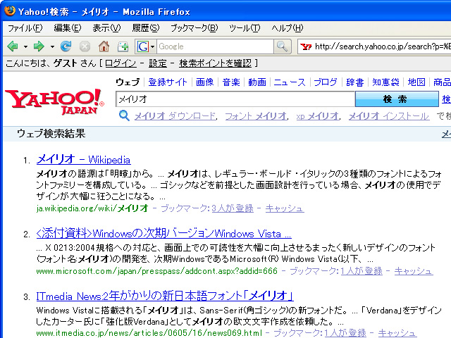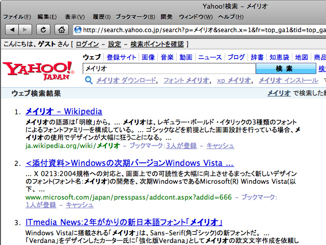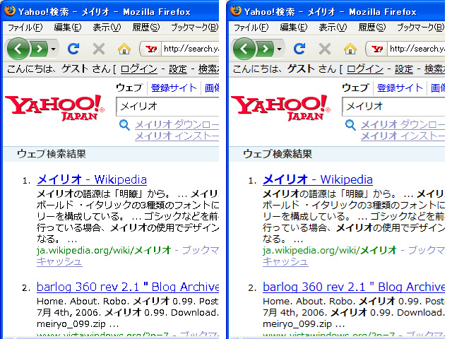 | 2008,06,18, Wednesday メイリオフォント XP + Firefox3WEBを見るときは Firefox派なんですが、Safari 3.1 for Windowsリリース以降は Safari を使ってました。 . なんか綺麗な見た目が好きなので。 でも最初はサクサク動くんですが、使ってるとだんだん重くなってくるような気がします。 あとfirefoxみたいな拡張機能があんまりなくて楽しくないです。 . 【Safari3.1】  . Firefox2のメモリ使用量を6割削減した、Firefox3 リリース とのことで早速インストールしてみました。 めっちゃ快適です  . 【Firefox2】 --- Firefox3の画像紛失したのでFirefox2のデフォルト  . でも、safariに慣れていたので見た目が・・・  . なんとかならんものかとネットで検索してたら、Windows Vista の標準フォント メイリオ(ClearType) にすると綺麗になりそう。 . メイリオフォントは Visual Studio 2008 Express Edition 日本語版に含まれているらしい。Visual Studio 2008 Express Edition は以前インストールしたのでフォントもインストールされてました。 . Firefox3の設定でフォントを メイリオ に変更(サイズは16では大きいので14に設定)。 でも、思ってたのと違う・・・ . ClearTypeを有効にする為に Microsoft PowerToys for Windows XP をダウンロード&インストール . で、ちょっとは綺麗になったような気がします。でも、見た目だけはsafariがいいかなー。 . ↓ . 【Firefox3 + メイリオ】 / 【Firefox3 + メイリオ + ClearType有効】  . しばらくは並行して使おうと思います 2008/06/18 19:00.18  コメントはこちら   Other Logs ◆ 2011/10/06 Macメンテナンス ◆ 2010/12/06 MacBook Air 11インチモデル ◆ 2010/07/11 ノートのバッテリー交換 ◆ 2010/06/09 Win機に Mac OS X を入れてみる ◆ 2010/06/05 WILLCOM CORE 3G ◆ 2009/05/08 Windows7 + VirtualBox ◆ 2009/05/07 Windows 7 RC ◆ 2009/03/01 22ワイド液晶買いました ◆ 2008/12/17 CakePHPの勉強を始めました ◆ 2008/06/18 メイリオフォント XP + Firefox3 ◆ 2008/05/09 dynabook SS2100 無線LANモジュール換装 ◆ 2008/05/02 dynabook SS 2100のRAM増設 ◆ 2008/04/01 W-Zero3でモバイル環境 ◆ 2008/04/01 [PHP]phpPgAdminでエクスポートするとエラーが出る ◆ 2008/02/06 マイコンのお勉強?Atmel AVR ◆ 2008/02/04 マウスパッド ◆ 2007/09/19 トップページが W3C HTML 4.01 Transitional に認定されました ◆ 2007/04/14 ディスプレイ買い替え ◆ 2007/04/10 黒御影 マウスパッド? ◆ 2006/11/01 New マシーン 最薄 14.9mm 重さ 1.09Kg ◆ 2006/01/25 マルチモニター |